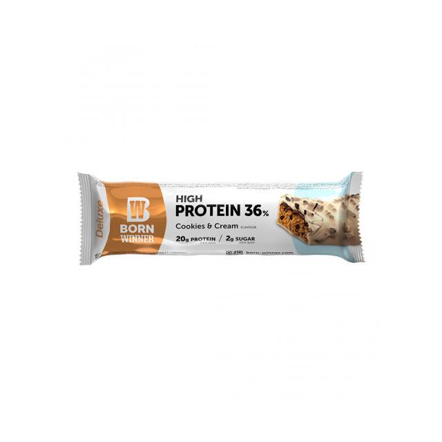 ОПИСАНИЕ Баровете от серията Born Winner Deluxe са удоволствие за сетивата. Върховен вкус и безкомпромисно качество. Без добавена захар. Високо съдържание на протеини – 20 грама. Една опаковка съдържа един бар от 55 грама с вкус на бисквитки с крем. Една кутия съдържа 12 броя. Ползи: многослойно хрупкаво барче високо съдържание на протеин 36% без добавена захар Съставки: 24% бял шоколад с подсладител (подсладител (малтитол), какаово масло, пълномаслено мляко на прах, емулгатор (лецитини (соя)), естествен ароматизант ванилия), млечни протеини, овлажнител (глицерол), колагенов хидролизат, вода, 5% тъмни парчета бисквити с подсладител (подсладител (малтитол), оризово брашно, царевично нишесте, кокосово масло, какао на прах с намалена мазнина (какао на прах с намалена мазнина, регулатори на киселинността: натриев хидроксид, амониев хидроксид), сол, естествен ароматизант ванилия, набухвател ( натриев хидроген карбонат)), соев протеин, пълнител (полидекстроза), 4% соеви какаови криспита (соев протеин, какао на прах, нишесте от тапиока), шоколад с подсладител (какаова маса, подсладител (малтитол), какаово масло, емулгатор (лецитини) , естествен ароматизант ванилия), палмова мазнина, ароматизанти, подсладител (сукралоза).