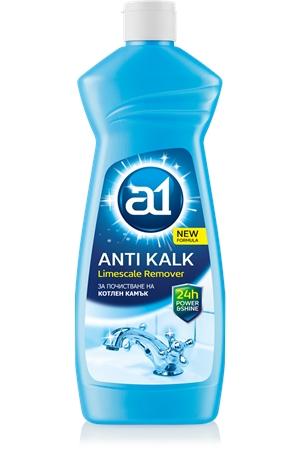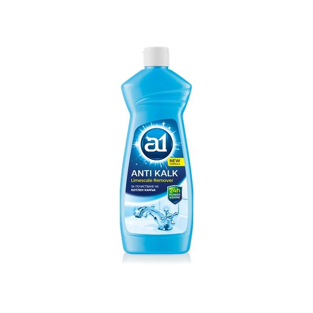 A1 КОТЛЕН КАМЪК е за почистване на котлен камък, сапунени отлагания и други замърсявания от душ - батерии, мивки, тоалетни чинии, хромирани и никилирани смесители и други. Придава блясък и остава свеж аромат.