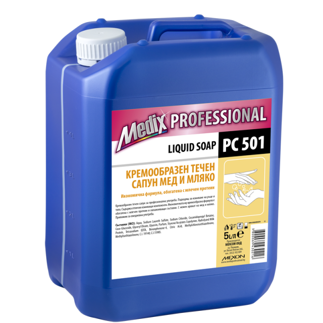 Медикс кремообразен течен сапун мед и мляко - 5л. РС 501 предлага нежна грижа за кожата, съчетавайки естествените свойства на меда и млякото. Този богат и кремообразен сапун не само почиства ефективно, но и хидратира и подхранва кожата, оставяйки я мека, гладка и с нежен аромат. Подходящ за ежедневна употреба от цялото семейство, Медикс РС 501 е идеалният избор за дома, офиса, ресторанти или обществени места, където е необходим висококачествен продукт за измиване на ръце. Голямата опаковка от 5 литра гарантира икономична и дълготрайна употреба, осигурявайки луксозна грижа за кожата всеки ден.