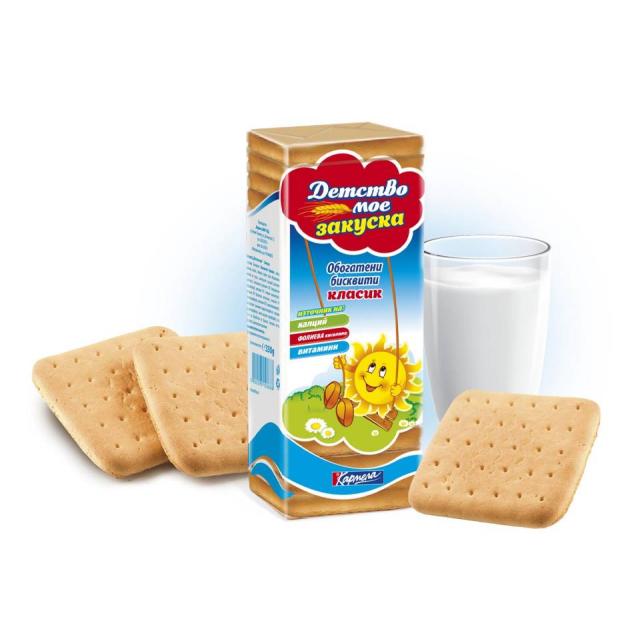 Обогатени бисквити Детство мое Закуска 330 г. са с добавен микс от витамини и минерали „Растеж и кости“. Те са източник на калции, витамини и фолиева киселина, не съдържат частично хидрогенирани масла, изкуствени оцветители и подсладители, и отговарят на изискванията на Наредба Nо 2 за здравословно детско хранене.