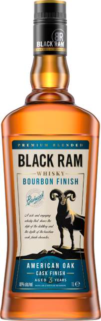Black Ram Premium Blended Whisky 3YO Bourbon Finish Мастърблендърите на Black Ram създават специфичния и неподражаем вкус на уискито, като съчетават силата на златния ечемик с мекотата на бистрата планинска вода. Смесват се специално подбрани зърнени дестилати, за да се получи бленд, подходящ за Black Ram с всички характерни вкусови качества за едно наистина добро уиски.За да поддържаме постоянно високо качество всяка една партида се блендира и разработва внимателно. До финалния вариант се правят редица междинни тестове на всички параметри. Black Ram Уискис е консумира най-добре с лед или няколко капки вода за достигане на пълна наслада. Тогава напитката развива целия потенциал на вкуса и аромата си. Отлежава 3 години в америакнски екс-бърбън бъчви. Алк.: 40 %