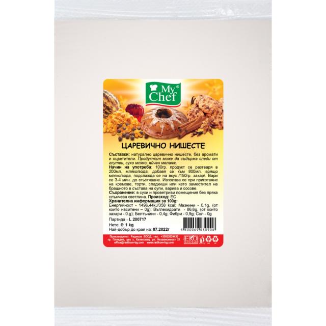 Начин на употреба: 100гр. продукт се разтваря в 200мл. мляко/вода, добавя се към 800мл. врящо мляко/вода, подслажда се на вкус /150гр. захар/. Вари се 3-4 мин. до сгъстяване. Използва се при приготвяне на кремове, торти, сладкиши или като заместител на брашното в състава на супи, варива и сосове.