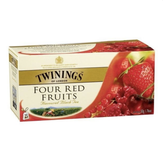 TWININGS Четири червени плода е черен чай, в който са добавени парченца плодове от малина, ягода, череша и френско грозде. Този чай впечатлява с прекрасен вкус и свеж плодов аромат.