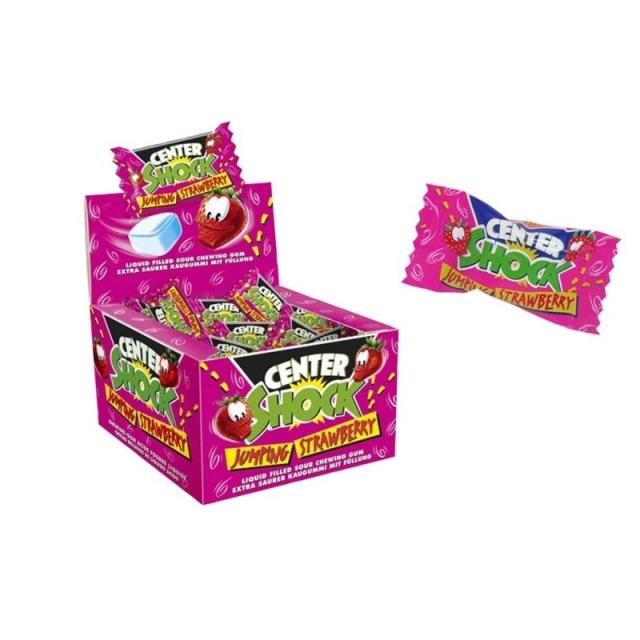 Дъвка с пълнеж (10,5%) от кисел сок с вкус на ягода. Шокиращо-кисели и сладко-ягодови. Може да откриете дъвките Center Shock в 3 различни вкуса: ябълка, ягода и кола.
