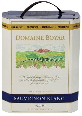 Domaine Boyar Sauvignon Blanc 5l Сорт: 100% Совиньон блан. Произход: Изба Сините скали, Домейн Бойар. Произход на гроздето: Тракийска Низина. Цвят: Златистозелен цвят. Аромат: Плодов и сортов аромат с нюанси на киви, пешън фрут и цитрус. Вкус: С много добра свежест, хармония, сочен и апетитен финал. Подходящи храни за консумация: Виното може да бъде сервирано самостоятелно, както и с вегетарианска храна, паста, пица, риба, пиле и меки сирена. Температура на сервиране: Охладено при температура 8-10 °C. Алк.: 13 %.