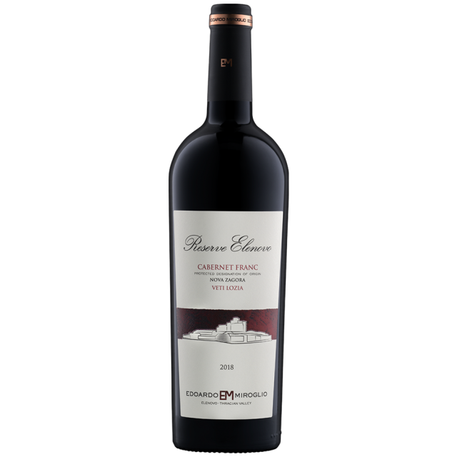 100% Каберне Фран от село Еленово! Еленово Каберне Фран притежава наситен рубинено-червен цвят с пурпурни отблясъци. Отличава се с атрактивен аромат с усещане за зрели черни череши и вишни, вплетени нюанси на какао, гъби и пикантни подправки. Вкусът е с отлична структура. Мощно вино с мека киселинност, пулсираща елегантност и хармония. Остава продължително в устата, с усещане за зрели сочни плодове. Отлежавало е: 15 месеца в 225 л барици от френски дъб. Подходящо е за ароматни терини от меса или черен дроб с подправки, печени и задушени агнешки меса, патешко или гъше месо със сладко-кисели сосове, пернат дивеч, ястия от телешко месо с подправки и винен сос.