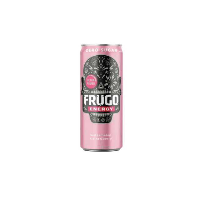 FRUGO ENERGY DRINK WATERMELON-STRAWBERRY FLAVOUR - газирана енергийна напитка с вкус на диня и ягода, и добавени витамини. Пастьоризирано, съдържа подсладители и източник на фенилаланин.