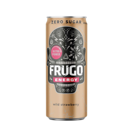 FRUGO ENERGY DRINK WILD STRAWBERRY FLAVOUR (GOLD) - газирана енергийна напитка с вкус на дива ягода и добавени витамини. Пастьоризирано. Съдържа подсладител. Високо съдържание на кофеин. Не се препоръчва за деца, бременни или кърмещи жени (32mg/100ml).