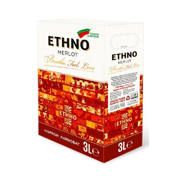 ВИНО ЕТНО МЕРЛО 3Л Ако искате вино, което да изпиете на един дъх, не се колебайте – изберете ETHNO Мерло. Цвят: Пурпурен, с гранатови оттенъци. Аромат: Доминиран от зрели черни череши, синя слива, съчетаващи се прекрасно с дискретните нюанси на ванилия. Вкус: Хармоничен и балансиран вкус, със зрели танини и приятна топлина на финала.