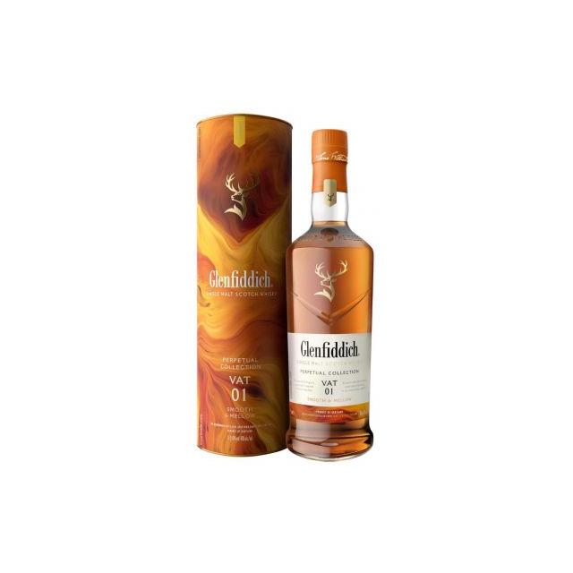 Glenfiddich Perpetual Collection VAT 01 e изключително елегантен сингл малц, подходящ за всеки вкус, предлагащ сладки и пикантни нотки. Уискито се прави в бъчви Solera, които никога не се изпразват, а винаги се пълнят поне до половината с уиски Glenfiddich. Благодарение на непрекъснатото смесване и постоянното движение, единичният малц обединява слоеве от сладки и пикантни нотки по уникален начин. Glenfiddich Perpetual Collection VAT 01 предлага опушени и сладки нотки на грозде, които са резултат от отлежаването в бъчви от бърбън и червено вино.