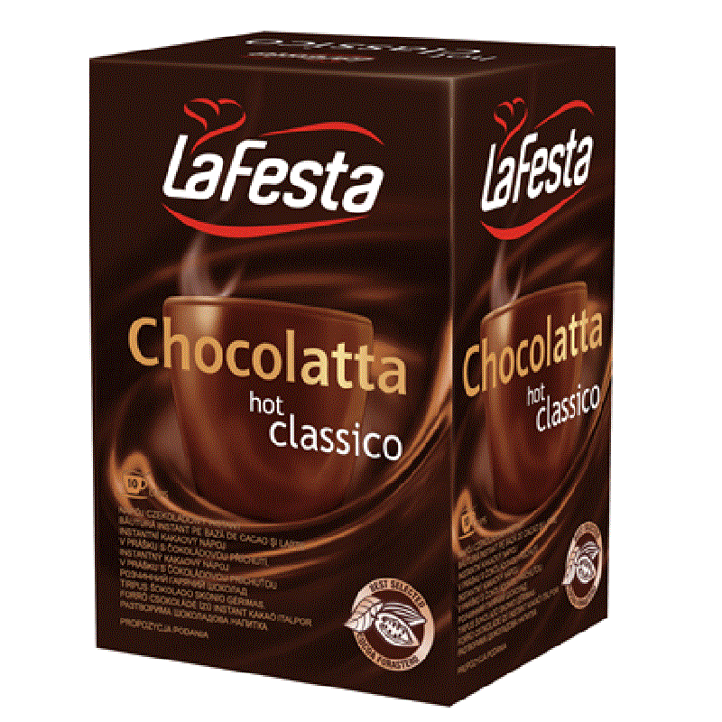 Горещ шоколад класик Ла Феста. La Festa Chocolatta hot Classico, разтворима какаова напитка. Съставка: захар, какао на прах (сухо какаово вещество мин15%), с ниско съдържание на мазнини (какаово масло 10-12%), СУРОВАТКА на прах, глюкозен сироп, хидрогенирана кокосова мазнина, обезсмаслено МЛЯКО на прах 2%, сол, набухвател-карбоксил метил, целулоза, аромати, амулгатор: лецинит от СОЯ, стабилизатор: докалиев фосфат.