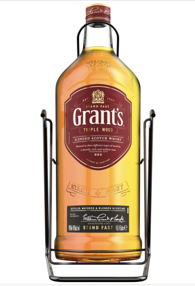 Поръчайте сега Грантс Трипъл Ууд Блендед Скоч Уиски 4.5 л Люлка с Картонена Кутия, от нашата колекция шотландско уиски в наличност!