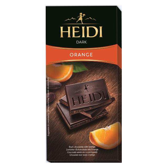 Тъмен шоколад Хайди с портокал. Шоколад Хайди с интензивен вкус на портокал. Може да се използва както за директна консумация, така и за приготвянето на различни сладкиши. В нашия блог може да разгледате интересни изпитани рецепти за десерти с шоколадите на Хайди! Шоколадът Хайди е едно от най-новите попълнения в богатото портфолио на марката Хайди. Доказано е, че консумирането на тъмен шоколад може да има благоприятно въздействие върху здравето на хората и дори е полезен.
