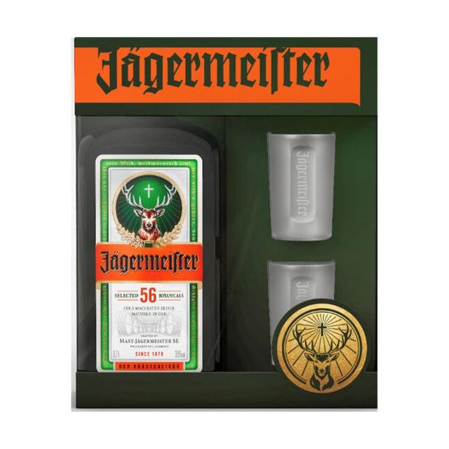 Jagermeister & 2 Shot Glasses Gift Set Jägermeister liqueur e немски билков ликьор, направен във Волфенбюте /Wolfenbüttel/, Германия. Тайната и строго пазена рецепта е създадена от Курт Маст през 1934г. и съдържа 56 билки, плодове, корени и подправки, включително цитрусова кора, женско биле, анасон, маково семе, шафран, джинджифил, женшен и плодове от хвойна, които придават на Jägermeister специфичен и неповторим вкус и аромат. Съставките на Jägermeister се смесват, филтрират и отлежават в дъбови бъчви за около една година, слет което ликьорът се филтрира отново, смесва се със захар, карамел и алкохол. Рецептата не е променена от създаването й, и все още се предлага в характерната зелена стьклена бутилка. Етикетьт на бутилките на Jägermeister има светещ християнски крьст, между рогата на елен. Това изображение е препратка към двамата християнски светии-покровители на ловците, Свети Хуберт и Свети Евстахий, и двамата приели християнството, след като преживели видение, в което видяли християнски крьст между рогата на елен. В превод Jägermeister означава главен ловджия. Аромат: Интензивен, билков, цитрусов. Вкус: Пиперлив, сладьк, плодов, с нюанси на индийско орехче. Послевкус: Пиперлив, плодов. Съвети за консумаци: Консумирайте Jägermeister, като класически билков ликьор или Ледено студен при - 18° С в шот чаша. Алк.: 35%.