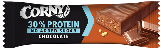 Сила и удоволствие – Corny Protein Power съчетава богат вкус от 30% висококачествен протеин (направен от суроватка, мляко и соя) и хрупкави оризови криспита, обвити с вкусен млечен шоколад. Без палмова мазнина и без добавена захар. Барът Шоколад от серията съдържа вкусен млечен шоколад с подсладител, хрупкави оризови криспита, кремообразен протеинов пълнеж с какао и естествени аромати. МЛЕЧЕН шоколад с подсладител 17 % (подсладител малтитол, какаово масло, МЛЯКО на прах, какао на прах с намалено съдържание на мазнини, емулгатор лецитин), СОЕВ протеин, ПШЕНИЧЕН протеин, подсладител малтитолов сироп, овлажнител глицерол, олигофруктоза, рапично масло, МЛЕЧЕН протеин, СОЕВИ люспи, какао на прах с намалена масленост, кокосови люспи, оризов чипс (оризово брашно, оцветител бета-каротин), естествени аромати, емулгатор лецитини. Може да съдържа ЯДКИ и ФЪСТЪЦИ.