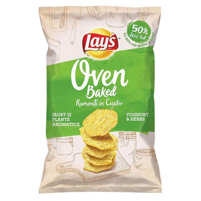 Печен продукт от картофи с йогурт и вкус на градински билкиСъставки: Картофени люспи (59%), НИШЕСТЕ, зеленчуково рапично олио, йогурт и вкус на билки [суроватка на прах от МЛЯКО, сол, лук на прах, захар, подобрители на вкуса (мононатриев глутамат, динатриев 5′-рибонуклеотиди) лук на прах, калиев хлорид, билки 0.12% (магданоз, копър, мента), йогурт на прах от МЛЯКО (0.12%), овкусители, регулатори на киселинността (ябълчена и лимонена киселина), захар, ПШЕНИЧНО брашно, емулгатор (СОЕВ лецитин), декстрозаУсловия на съхранение: Да се съхранява на сухо и прохладно място, далеч от слънчева светлинаВид на опаковката или обработката на продукта: Опакован в защитна атмосфераНетно количество 125gСтрана на произход Произведено в EUВносител ВИСТА АВТ АДХранителни стойностиЕнергийна стойност за 100 g, kJ 1851Енергийна стойност за 100 g, kcal 440Мазнини, g 14 – от които наситени мастни киселини, g 1,6Въглехидрати, g 70 – от които захари, g 10Белтъчини, g 5,3Сол, g 1,3