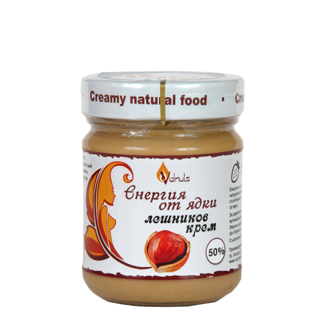 Състав: Печени белени лешници 50%, захар, нехидрогенирана