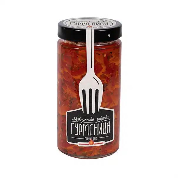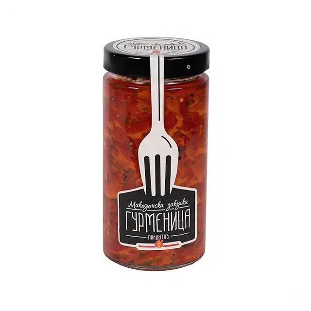 Пикантна македонска закуска „Гурменица“ е традиционно македонско ястие, направено от мариновани, сочни червени чушки с месеста и плътна структура. Тази пикантна версия на гурменицата е перфектен избор за любителите на люти храни.
