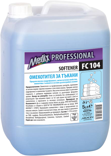 Медикс омекотител за тъкани - 5л. FC 104 е идеалното решение за грижа и защита на вашите дрехи. С формула, която осигурява невероятна мекота и свежест, този омекотител придава на текстила нежност и комфорт, като предотвратява статичното електричество. Подходящ за всички видове тъкани, Медикс FC 104 прави вашите дрехи не само приятно меки, но и лесни за гладене. С голямата си опаковка от 5 литра, този омекотител е икономичен и практичен, осигурявайки дълготрайни резултати и приятен аромат при всяко пране.