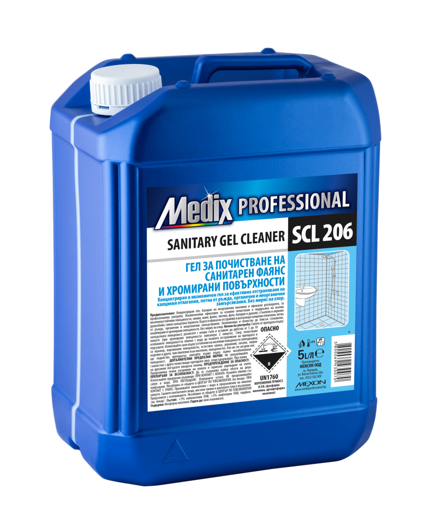 Медикс гел за почистване на санитарен фаянс и хромирани повърхности - 5л. SCL 206 е вашият надежден помощник за поддържане на безупречна чистота в банята и тоалетната. С иновативната си формула, този гел ефективно премахва упорити замърсявания, котлен камък и петна, оставяйки повърхностите блестящи и хигиенични. Подходящ за използване върху санитарен фаянс, хромирани кранове и душове, Медикс SCL 206 гарантира нежна, но мощна грижа, без да поврежда повърхностите. С обем от 5 литра, този почистващ продукт предлага икономичен вариант за дългосрочна употреба, идеален за дома, офиса или обществени заведения.