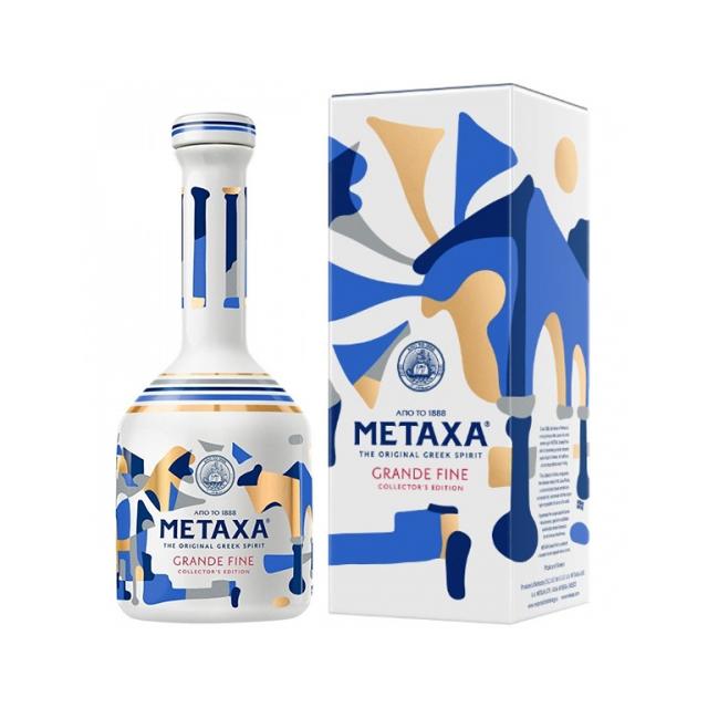 Metaxa Grande Fine Collector's Edition Изящно колекционерско издание на Metaxa Grande. Красивата керамична бутилка е проектирана от атинския уличен художник Cacao Rocks. С това произведение на изкуството той отдава почит на Гърция, нейното изкуство и вдъхновяващ начин на живот. Уникален вкус на гроздово бренди, мускатово вино от остров Самос и средиземноморски цветя. Алк.: 40 %