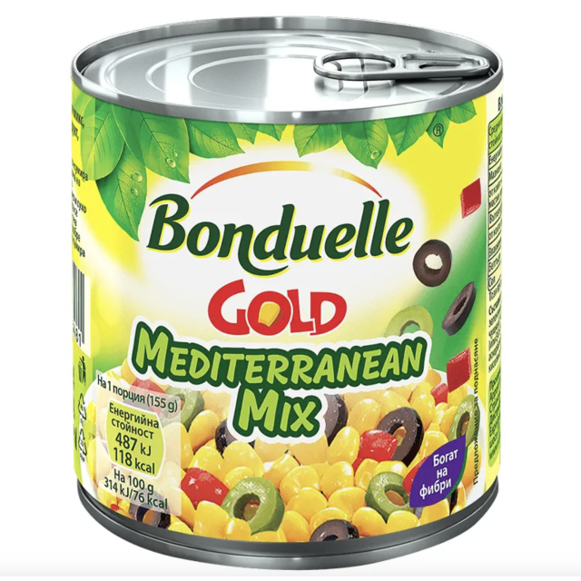 Съставки: Зеленчуци (сладка царевица на зърна 65%, зелени маслини 6,5%, черни маслини 6,5%, червени чушки 6,5%), вода, сол, сгъстители: ксантанова гума (или Е415) - гума гуар (или Е412), антиоксидант: аскорбинова киселина (или Е300), киселини: лимонена киселина или Е330 - млечна киселина (или Е270)