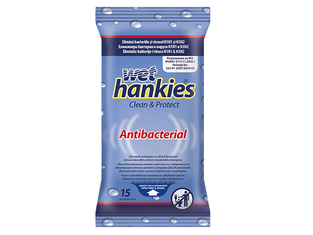 Антибактериални кърпички, съдържащи алкохол и допълнителен антибактериален агент, за по-добро действие. Те убиват 99,9% от бактериите. Мокрите кърпички почистват и освежават кожата, подходящи за употреба в дома, в офиса, в колата.
