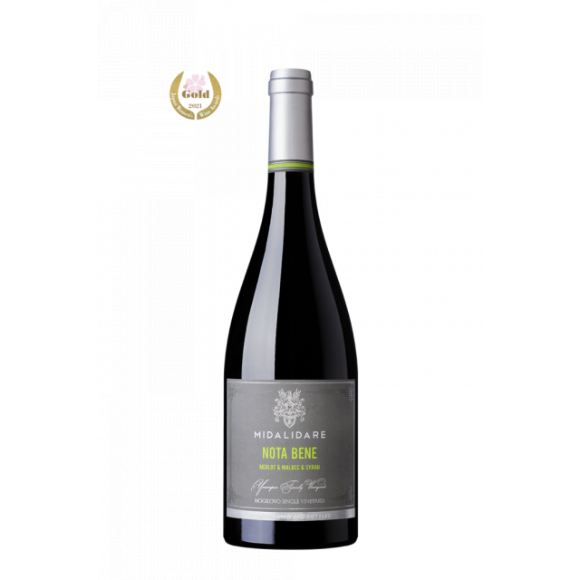 Nota Bene Всички винени сортове, които се отглеждат в Мидалидаре, са внимателно подбрани с оглед собствените им характеристики и тероарните особености на Могилово. Но има три червени сорта, които изпъкват в развитието си и вдъхновяват създаването на Nota Bene. Уникален троен купаж от Мерло, Малбек и Сира, в различно съотношение за всяка реколта, Nota Bene „обръща внимание“ на най-доброто от Мидалидаре, събрано в бутилка червено вино. Наименование и произход: Червено вино, бленд от Мерло, Малбек и Сира „Нота Бене“ от България, ЗГУ Тракийска низина, Могилово. Собствени лозя на Мидалидаре, лозови масиви Каралиец и Дабовец (сертифициран за Био производство). Сорт: Бленд от 75% Мерло от Каралиец, 15% Малбек от Дабовец и 10% Сира от Дабовец. Реколта: 2021. Обем: 750 мл. Затваряне: Коркова тапа, натурален корк. Алкохолно съдържание: 14 об. %. Зрялост: Готово за консумация, но може да отлежава в бутилка 3-5 години.