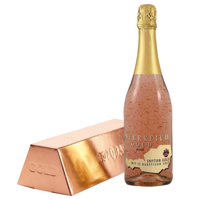 Остерайх Голд Розе Елегантно пенливо розе от леко пресовано грозде,със свеж цвят, отличен плодов аромат и завладяващ вкус. Златните 23-каратови частици, подчертават неговата елегантност, като създават усещане за „златна магия“ в бутилката. Идеалното вино за тези, които търсят нещо изключително за подарък или специален повод. Златото в бутилката, може да се консумира и е безопасно за вашето здраве.!