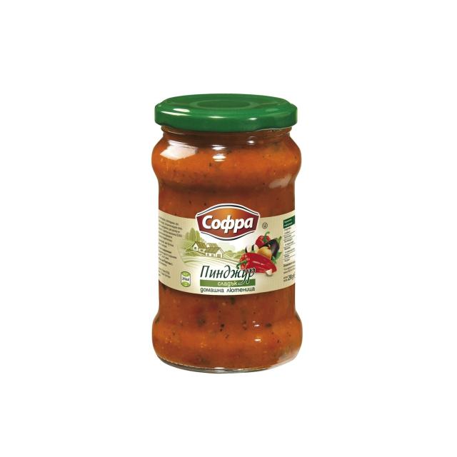 Софра Пинджур Сладък е за ценителите на домашната зимнина. Създаден по традиционна рецепта Пинджур на Софра включва внимателно подбрани и овкусени сладки пиперки, патладжани и домати. Може да го поднесете при специални поводи или да си доставите удоволствие всеки ден. Идеално е да го добавите към менюто си през зимните месеци, когато пресните зеленчуци са значително по-малко. Но може да го похапвате и през останалото време на годината. Сервирайте го като предястие, салата или го добавете към основното блюдо. Този продукт може да се използва веднага след отваряне, така че е подходящ и за пикник сред природата.