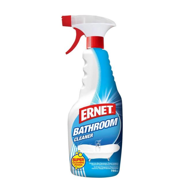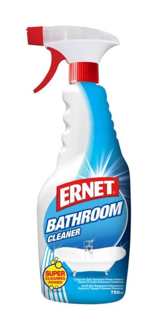 Почистващ препарат Ernet за баня премахва замърсяванията и петната от варовик. Изплаква се лесно и осигурява блестящо почистване без силно триене. Подходящ е за смесители, мивки, вани, плочки, душ кабини и вскякакъв вид санитария в банята. Течността от препарата при напръскване излиза под формата на пяна.