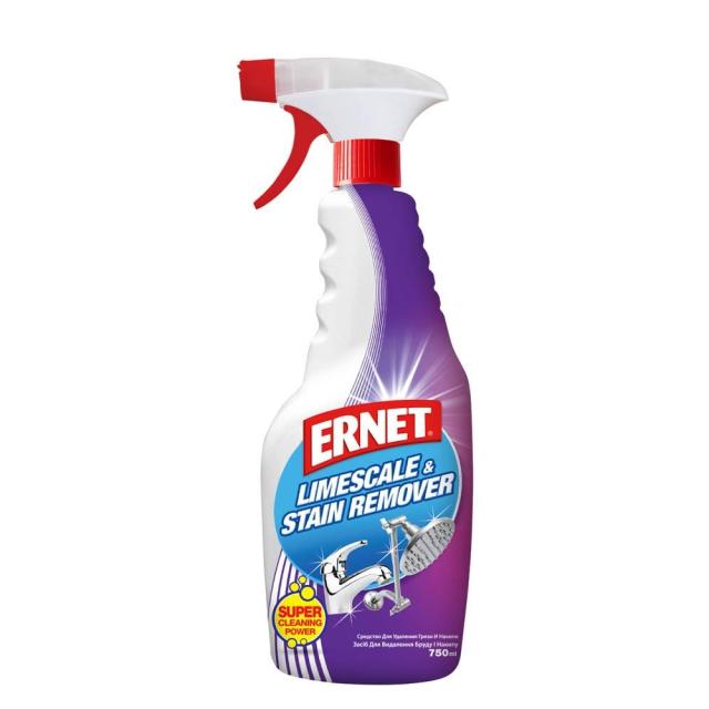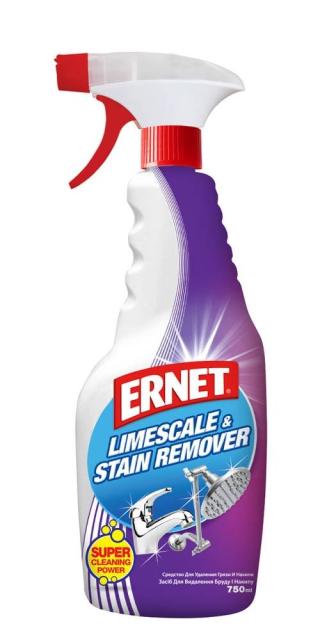 Почистващият препарат Ernet за котелн камък и ръжда 750 мл премахва замърсяванията от котлен камък и ръжда в банята и кухнята. Предотвратява появата на петна, придава блясък и оставя свеж аромат. Лесно се изплаква, без силно търкане. Подходящ е за почистване на мивки, вани, тоалетни, стъклени или акрилни душ кабини, кранове, хромирани повърхности, мивки от неръждаема стомана и керамика, керамични подове и плочки и повърхности с PVC покритие.