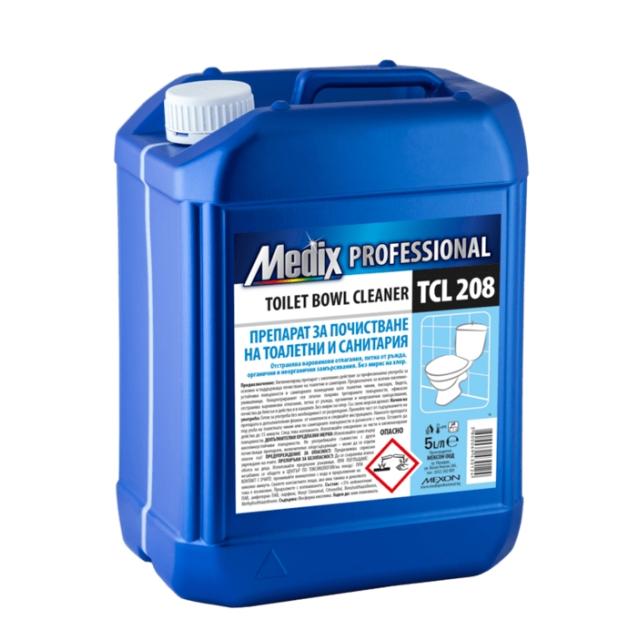 Медикс препарат за почистване на тоалетни и санитария - 5л. TCL 208 е мощен почистващ продукт, създаден да осигури безупречна хигиена и дезинфекция на тоалетни, бани и други санитарни помещения. Формулата му ефективно премахва упорити замърсявания, котлен камък, петна и неприятни миризми, като оставя повърхностите чисти и свежи. Подходящ за използване в дома, офиси, ресторанти и обществени сгради, Медикс TCL 208 е икономичен и удобен с голямата си опаковка от 5 литра, осигурявайки дълготрайна чистота и лесна поддръжка на санитарните помещения.