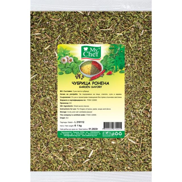РОНЕНА ЧУБРИЦА BG: Съставки: Сухи листа градинска чубрица Начин на употреба: За подправяне на пици, спагети, супи и варива. Съхранение: В сухи и проветриви помещения без пряка слънчева светлина Фирмата е сертифицирана по: FSSC 22000 Произход: ЕС