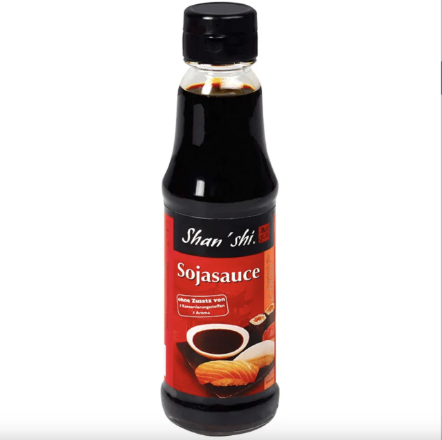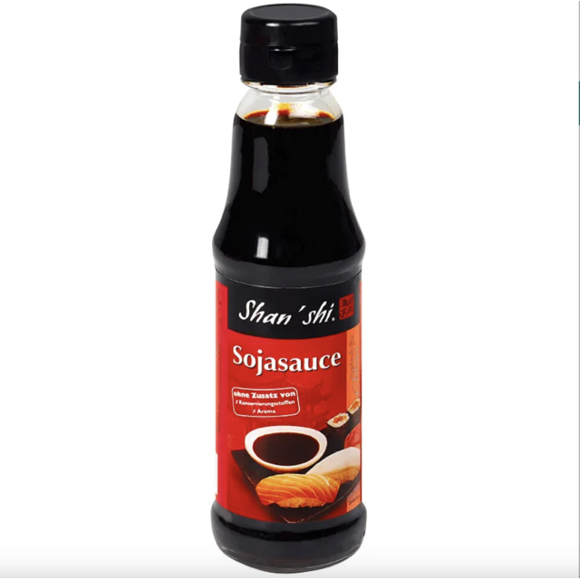 Шан-Ши Соев сос, 150мл. След отваряне съхранявайте в хладилник и консумирайте в рамките на четири седмици. Съставки: СОЕВ сос (46%) (вода, СОЕВИ зърна, ПШЕНИЦА, сол), вода, захар, сол, оцветител: амонячен карамел, регулатор на киселинността: млечна киселина, лимонена киселина. Може да съдържа следи от ФЪСТЪЦИ и СУСАМ.