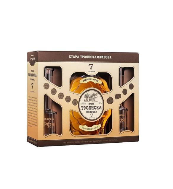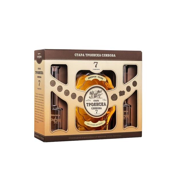 Оригиналният комплект съдържа бутилка висококачествена 7-годишна сливова ракия и две стъклени юзчета. Подходящ за подарък. Старата сливова ракия отлежава в дъбови бъчви най-малко 7 години. Алкохол: 42%