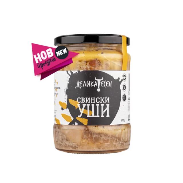 Свински уши в бульон в буркан, стерилизирани по традиционна рецепта със сол. Деликатес, подходящ за директна употреба или приготвяне на вкусни и лесни рецепти. 100% свински уши в бульон, сол, червен и черен пипер
