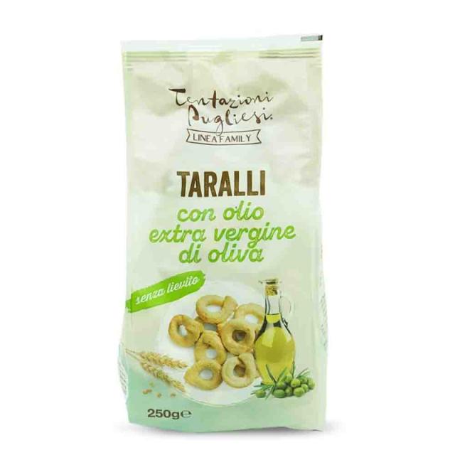 Тарали са символ на празничността в Пулия, които трябва да се ядат в компанията на семейството и гостите. Перфектни са за сервиране като аперитив или предястие, придружени от сушени меса или сосове, но и за похапване като лека закуска през деня. Традиционно се приготвят с много малко съставки, изцяло натурални и от нашата земя и ние спазваме точно тези правила. Обичаме да уважаваме традицията на нашата любима Пулия, защото това ни кара да си спомним за нашите баби, когато са ги приготвяли за нас като деца и кухнята е била изпълнена с вкусни аромати.