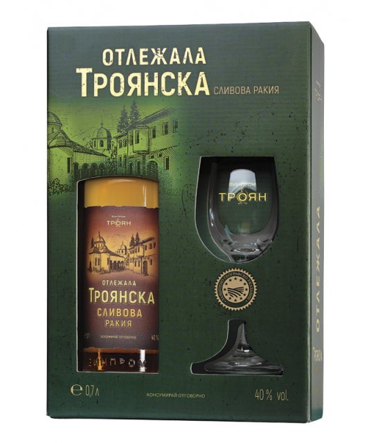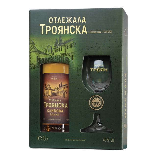 Троянската сливова ракия, отлежала не по-малко от 6 месеца в дъбови бъчви до постигане на характерния златист цвят, аромат и мек вкус е позната на всеки един българин. Тази ракия е готова да задоволи и най-взискателните познавачи на качествен алкохол. В подаръчния комплект влиза стъклени чаша на столче с логото на "ВИНПРОМ - ТРОЯН".