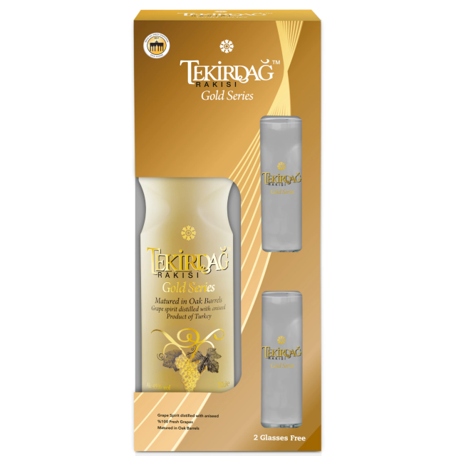 Tekirdag Raki Gold with 2 Glasses Златната Текирда ракъ е създадена от комбинацията на най-добрите тракийски гроздови зърна и на най-висококачествения анасон, който Западна Анадола предлага. Дестилира се 2 пьти. Мекотата и невероятния й вкус са подобрени след отлежаване в дъбови бъчви, на което дължи отличителния си златен цвят. Алк.: 45%.