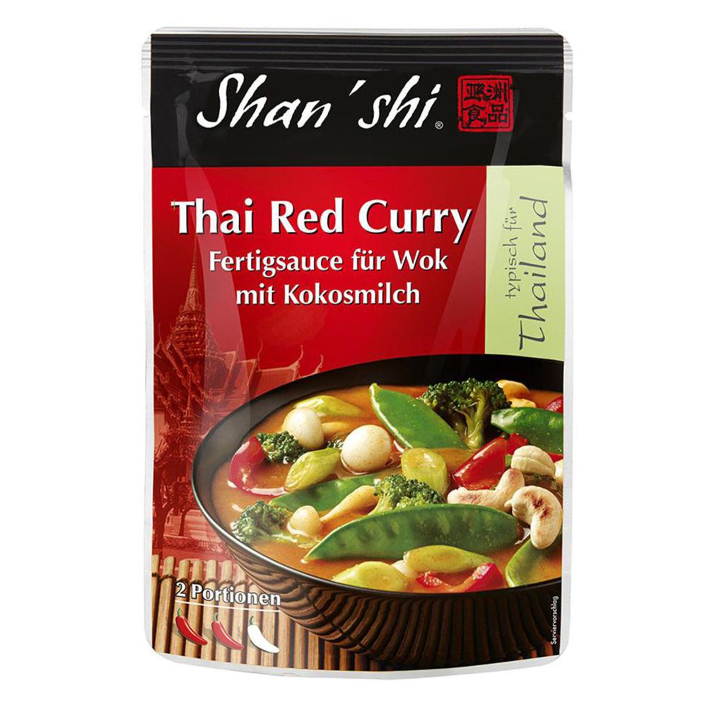Добре познатото Тай червено къри за готвене се получава от пикантно чили и кокосово мляко, тази комбинация добавя чудесен пикантен вкус на ястието. Просто изпържете 300 грама месо, морски дарове или зеленчуци, добавете Shan'shi Тай червено къри и оставете да къкри за 3-4 минути ( за две порции). Сервирайте Тай червено къри ястие със Shan'shi оризови нудъли.