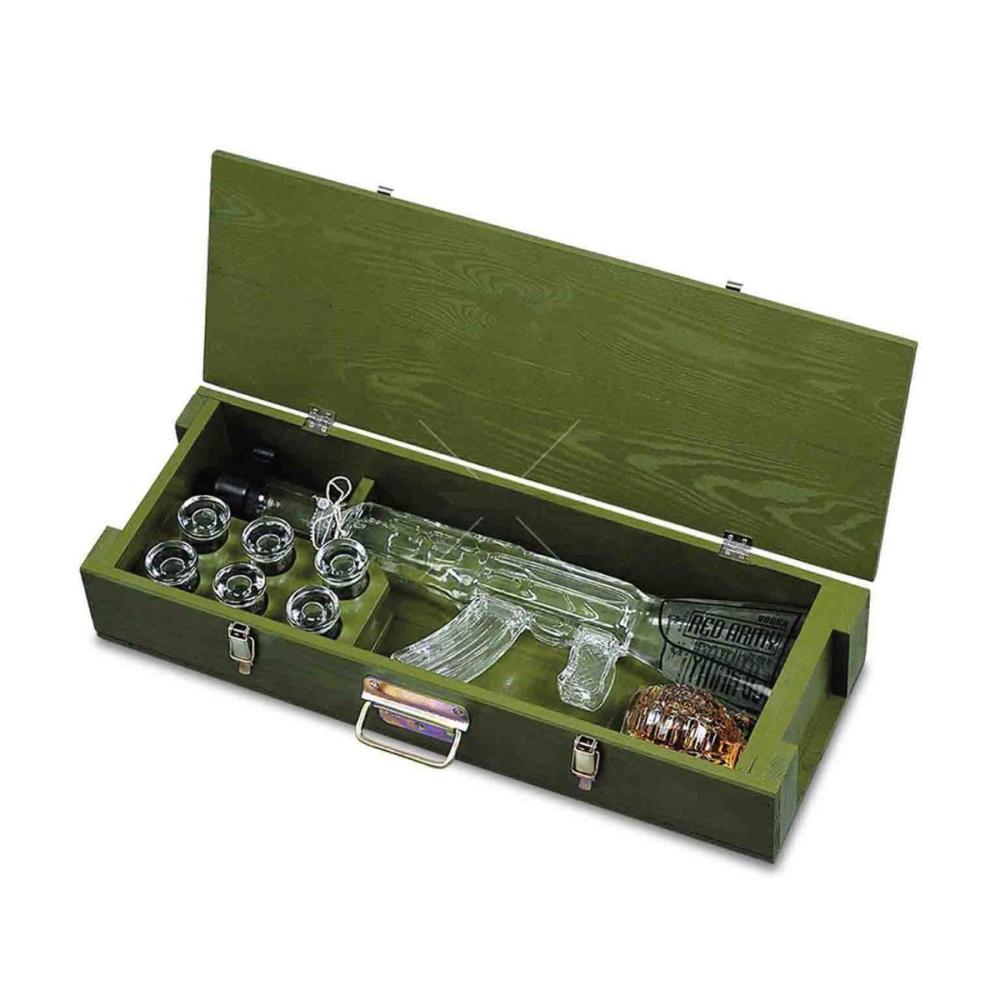 Kalashnikov Red Army, комплекта съдържа: Бутилка руска водка под формата на Калашников АК-47, декоративна бутилка граната с руска водка, ароматизирана с билки и плодове, и 6 бр. чаши. Бутилките се предлагат заедно със съдържанието, общо 1,2л. Ограничена серия. Комплектът е много подходящ за подарък.