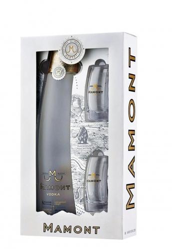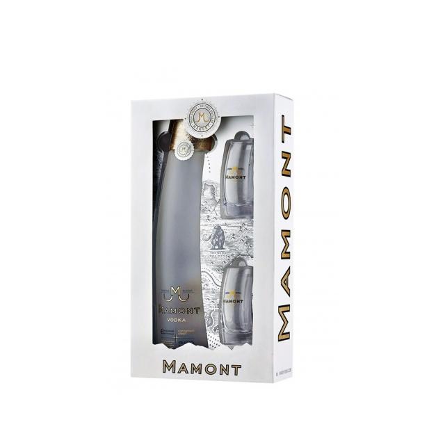 Vodka Mamont gift set Една от най-изисканите и чисти напитки в Русия, произведена в една от най-старите дестилерии, с подарък две ембламатични чаши. При приготвянето му се използват кедрови ядки. Водата, използвана за нейната дестилация, идва от планините Алтай, известни със своята чистота. Бялата зимна пшеница се отглежда в плодородните равнини на Алтай. Алкохолът се дестилира пет пъти, за да се получи мек вкус. След това водката се филтрира през въглен от сибирска сребърна бреза. Вкус с нотки на сладост и сух финал. Местните естествени съставки и контролът на качеството по време на всеки производствен етап са ключовите компоненти, които правят тази водка изключително качествена. Алк.: 40 %