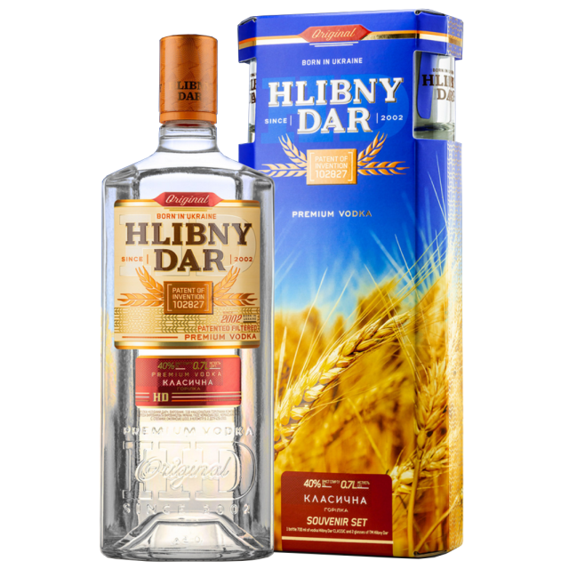 Украинската водка Хлебний Дар Класик 0.7 л с 2 шот чаши е висококачествена водка, произведена в Украйна, със специално подбрани съставки, които придават чист и гладък вкус. Със своето балансирано съдържание на алкохол и гладка текстура, Хлебний Дар Класик е идеален за консумация чиста или за приготвяне на коктейли. В комплект с две шот чаши, тази водка е отличен избор за подарък или за споделяне с приятели на специални събития и празници. Насладете се на качеството и изискания вкус на Хлебний Дар Класик.