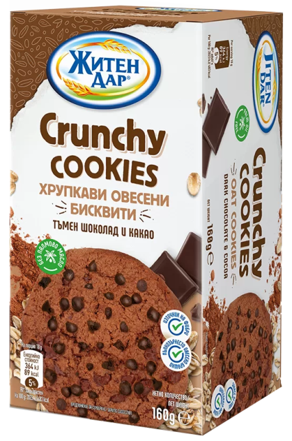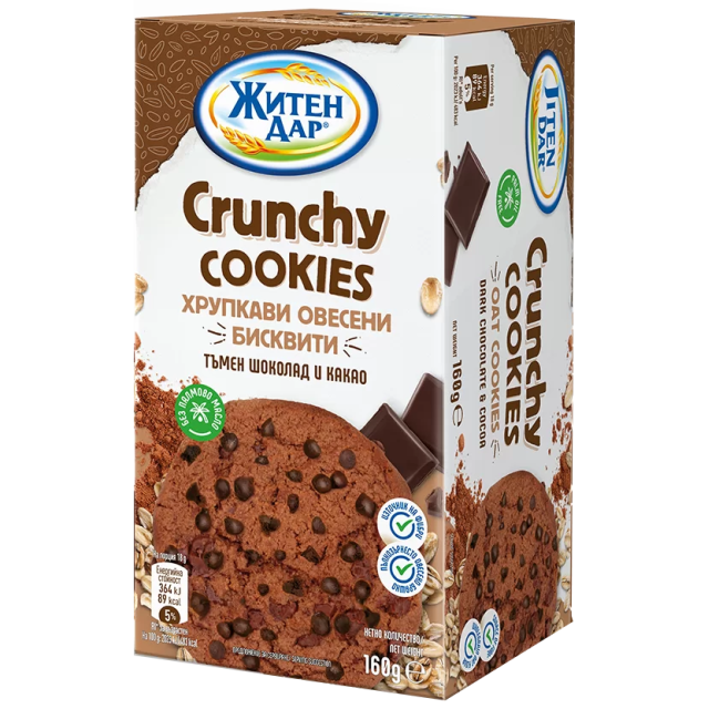 Насладете се на изключително качество и невероятен вкус на Crunchy Cookies с какао и парченца тъмен шоколад за неповторимо шоколадово изживяване.