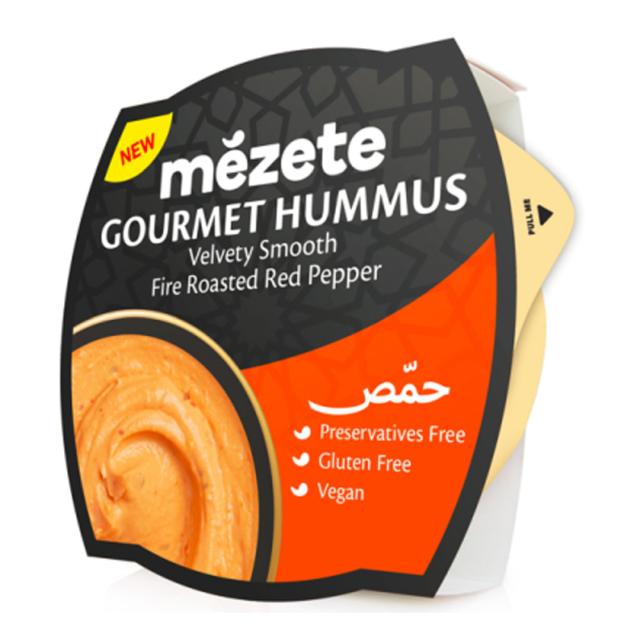 Мезете Хумус Печена Червена Чушка 215г.Хумус е хранителна паста, направена от нахут и тахан (сусамов) с овкусители като зехтин, чесън, червен пипер и лимонов сок. Ястието е извънредно популярно в целия Близък изток сред всички групи население.Хумусът се използва и за разядка или гарнитура на много основни ястия, като мезе и като сос към фалафел, израелска салата, пиле на грил и патладжани.